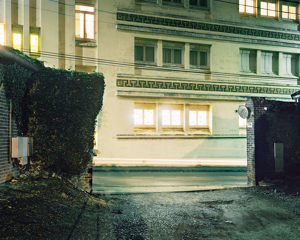 Quand j’ai pris mes premières photographies de nuit à Clermont de l’Oise, je ne connaissais pas véritablement les motivations de ce choix. C’est après avoir longé à maintes reprises un long bâtiment éclairé toute la nuit que j’ai mieux saisi l’objet de mon attirance. L’établissement psychiatrique établi en centre ville, produit un irrésistible effet d’attraction avec ses lumières froides et crues jaillissant de larges et nombreuses fenêtres. L’activité semble ne pas s’interrompre, même en ces heures avancées de la nuit. Ici, la notion de répit pourrait bien appartenir à un autre monde. Ce centre spécialisé, l’un des premiers et des plus grands hôpitaux de France, est intimement lié à l’histoire de Clermont de l‘Oise. Implanté en pleine ville et étendu sur une vaste superficie, inévitablement lors de mes marches je contourne et retombe sur ses murs d’enceintes historiques. C’est la proximité de ce lieu qui m’a amené à photographier la nuit. La lumière nocturne me procure ici comme un sentiment d’une réalité dénaturée.